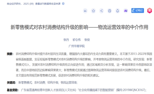 2025年5月,管理学院张丹老师以第一作者身份在《商业经济研究》发表学术论文,题为“新零售模式对农村消费结构升级的影响——物流运营效率的中介作用”,系广东省普通高校青年创新人才类项目(人文社科)“社会化传播视阈下的智能营销”(编号:2019WQNCX167)阶段性成果。《商业经济研究》(Journal of Commercial Economics)是北京大学《中文核心期刊要目总览》来源期刊,创刊于1982年,是由中国商业经济学会主办,国内外公开发行的贸易经济类核心期刊。