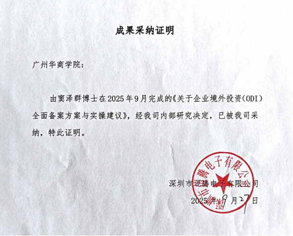 2025年9月,深圳市迈腾电子有限公司正式采纳广东乡村振兴金融研究中心窦泽群博士撰写的《关于企业境外投资(ODI)全面备案方案与实操建议》咨询报告。该报告针对企业境外投资备案的复杂性与监管动态变化,为迈腾电子提供了系统性解决方案。